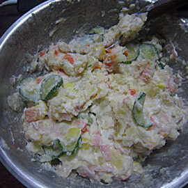 4. じゃがいも、にんじん、キュウリ、ハム、コーンをあえる。