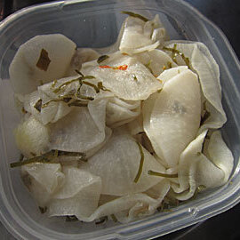 がごめ昆布の細切りを使って大根の千枚漬けを作りました。